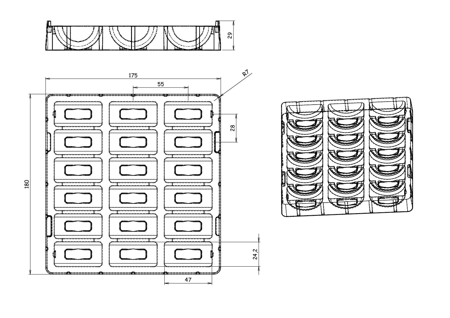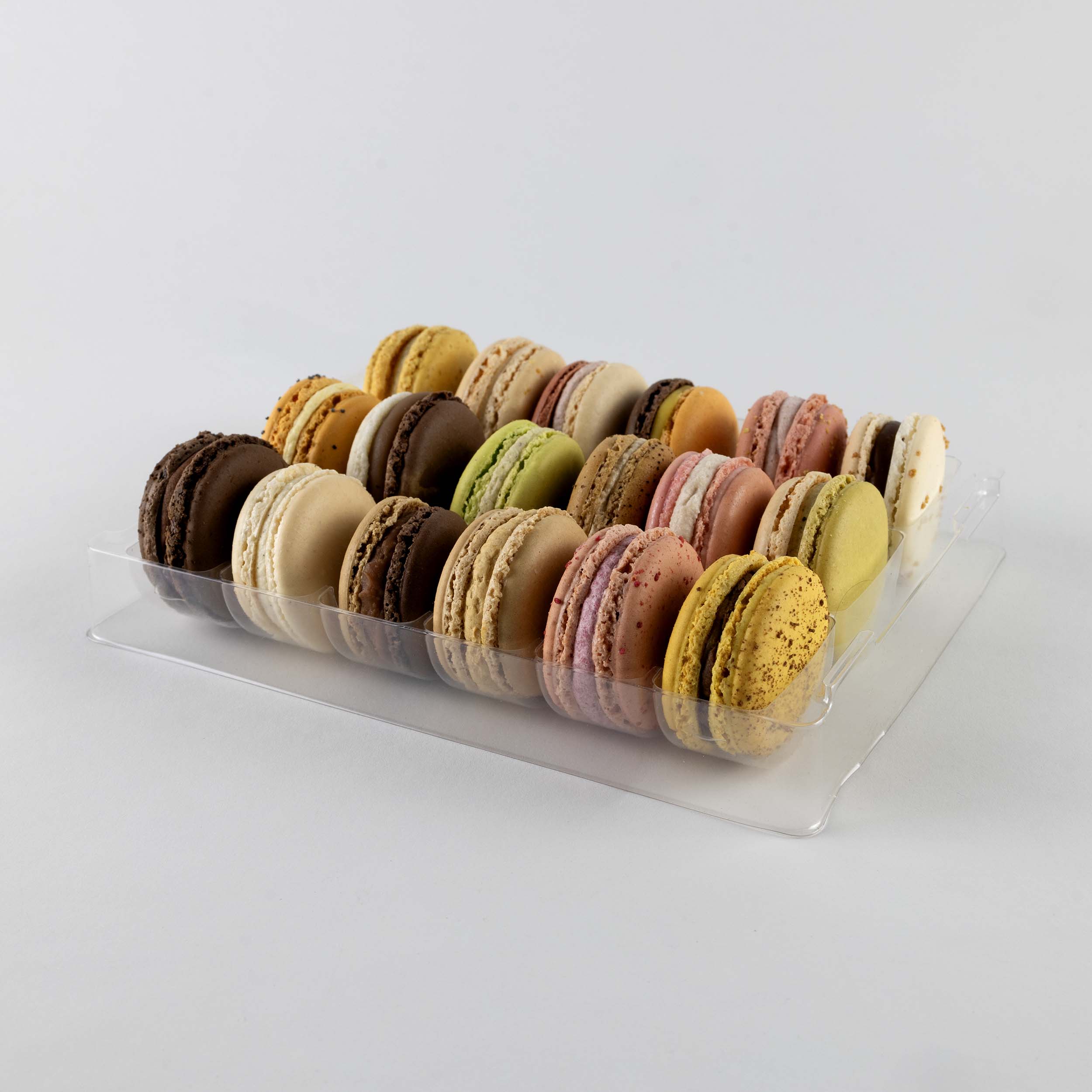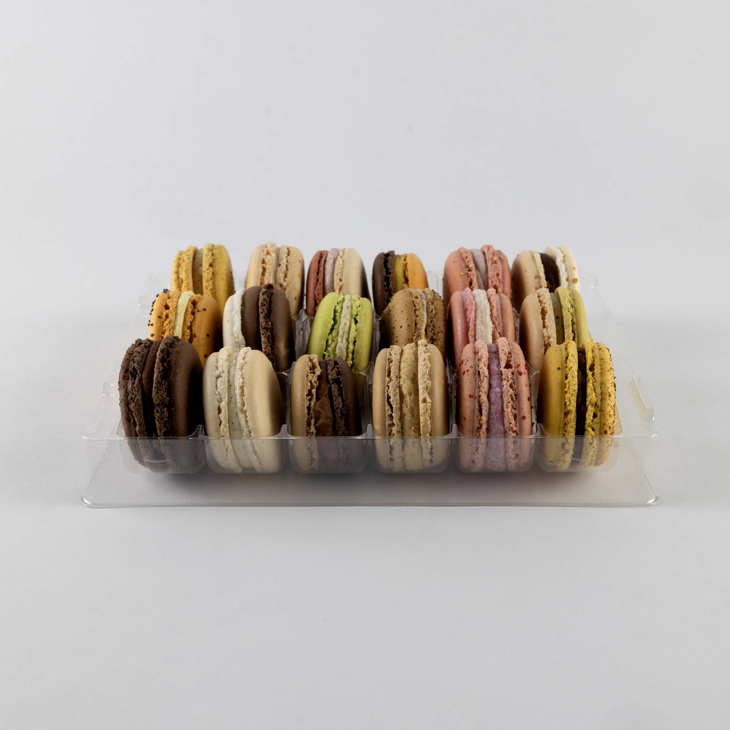 Calage 18 macarons Matière : APET Cristal 400µ Dimensions : 180 x 175 mm Empreinte Macarons : Ø 47 mm PAR CARTON DE 180 pcs
